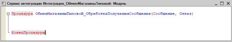 Копировать в буфер обменаПроцедура ОбменМагазиныТиповой_ОбработкаПолученияСообщения(Сообщение, Отказ) Интеграция_Обработчики.ОбработатьВходящееСообщение(Сообщение, Отказ); КонецПроцедуры