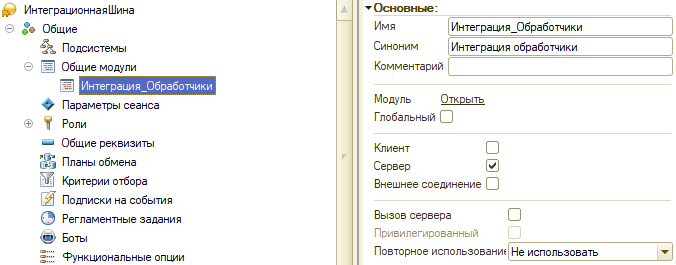 Для реализации обработчиков отправки и получения сообщений необходимо создать в расширении общий серверный модуль "Интеграция_Обработчики":