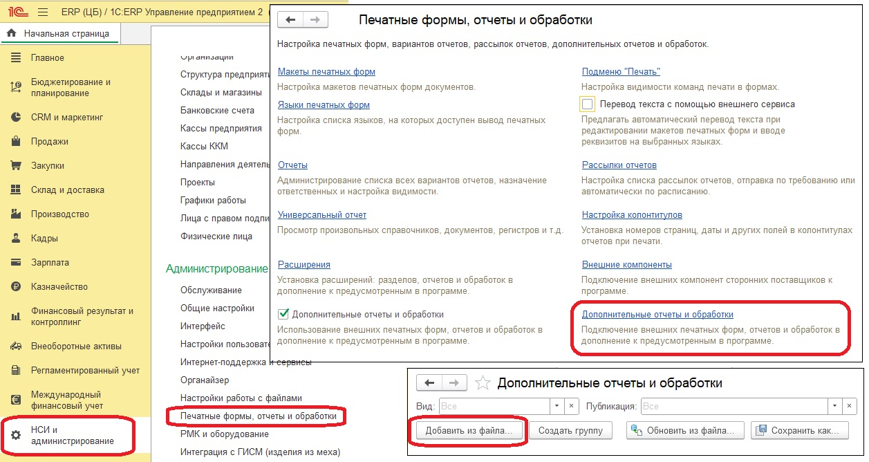 В информационной базе 1С:ERP нужно выбрать раздел "НСИ и Администрирование", далее выбрать "Печатные формы, отчеты и обработки", "Дополнительные отчеты и обработки", в открывшемся окне нажать на кнопку "Добавить из файла":