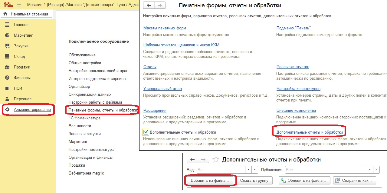 В информационной базе 1С:Розница нужно выбрать раздел "Администрирование", далее выбрать "Печатные формы, отчеты и обработки", "Дополнительные отчеты и обработки", в открывшемся окне нажать на кнопку "Добавить из файла":