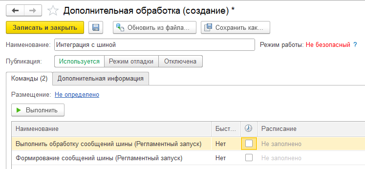 После того, как расписание будет задано нужно нажать на кнопку "Записать и закрыть". После записи дополнительной обработки автоматически будут созданы соответствующие регламентные задания.