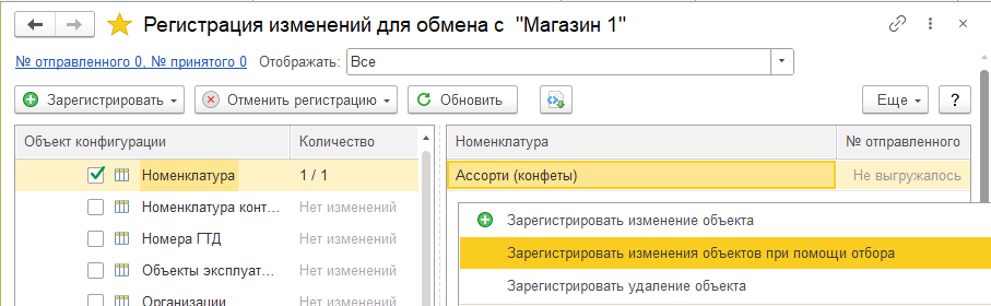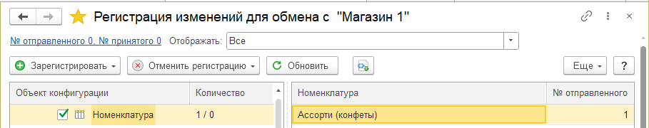 Откроется форма "Регистрация изменений для обмена данными". В качестве тестового примера зарегистрируем номенклатуру "Ассорти (конфеты)":
