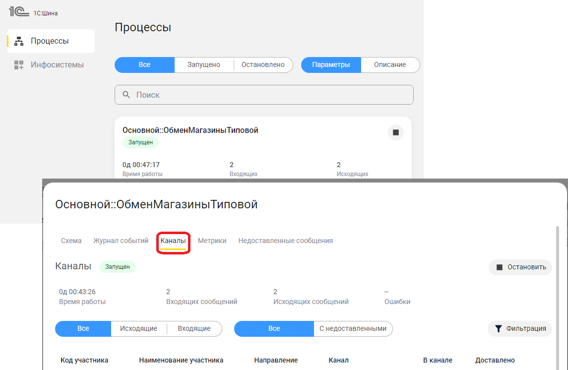 Чтобы просмотреть счетчики каналов необходимо в приложении "1С:Шины" щелкнуть на процессе интеграции "Основной::ОбменМагазиныТиповой", далее перейти на вкладку "Каналы":