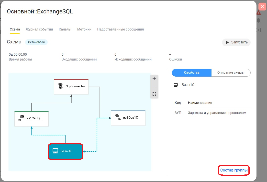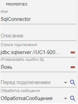 Сообщения поступают в шину через узел вида "Канал1СИсточник" (узел "из1СвSQL") и доставляются в узел "SqlConnector". В узле "SqlConnector" происходит обработка сообщения, в зависимости от переданного параметра выполняется запрос к базе SQL, далее подготовленный ответ отправляется в "Канал1СНазначение" (узел "изSQLв1С").