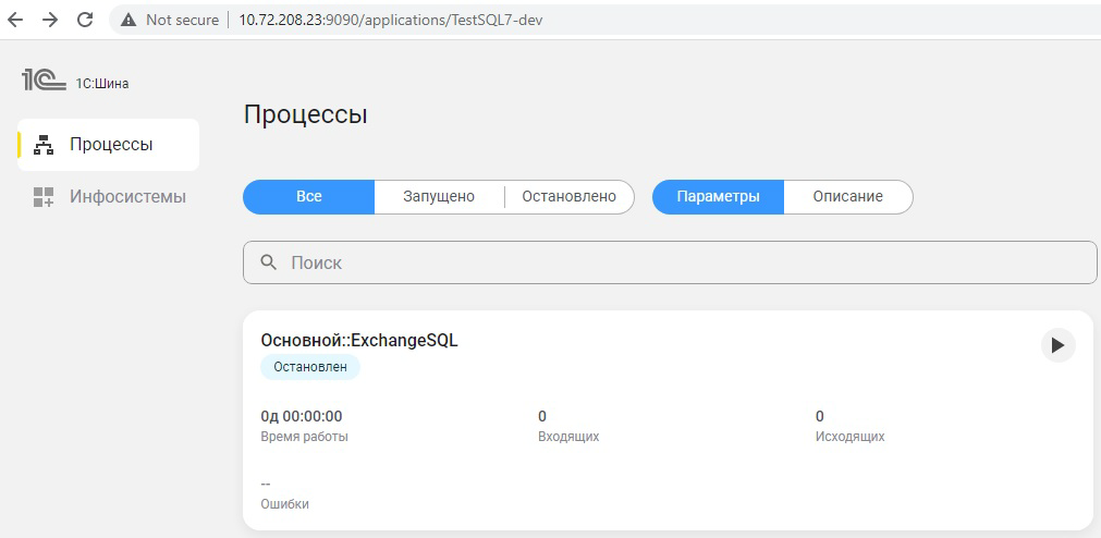 После успешной авторизации откроется вкладка приложения "1С:Шины", на ней будет отображен список процессов интеграции, существующих в приложении. В тестовом примере будет единственный процесс интеграции "Основной::ExchangeSQL":