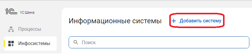 Для добавления информационных систем в приложении "1С:Шины" необходимо перейти на вкладку "Инфосистемы" и нажать на кнопку "+Добавить систему":