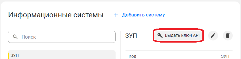 После добавления информационной системы необходимо получить ключ, который она будет использовать при подключении к серверу "1С:Шины". Чтобы получить ключ, нужно выбрать информационную систему, а затем нажать кнопку "Выдать ключ API":