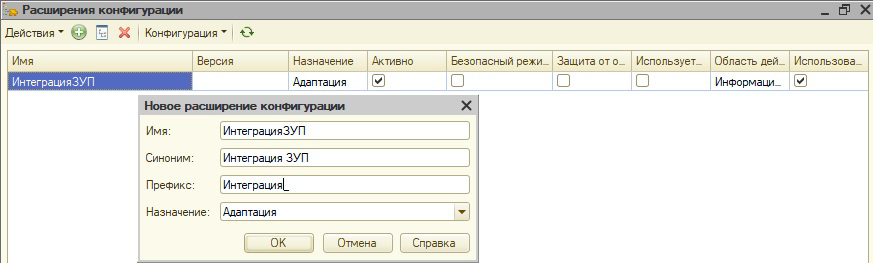 Для создания расширения откроем конфигуратор информационной базы "1С:Зарплаты и управления персоналом КОРП" и создадим расширение, в котором выполним необходимые доработки для взаимодействия с "1С:Шиной".