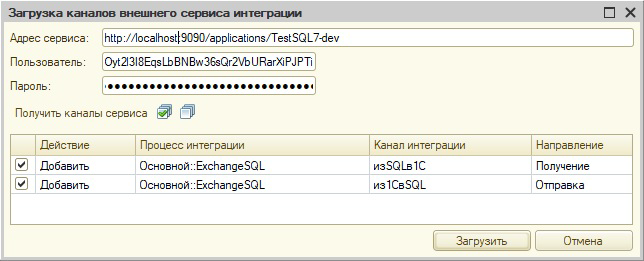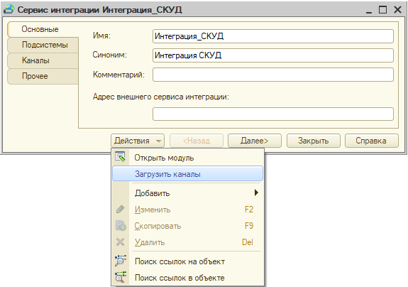 Далее требуется загрузить информацию о доступных каналах интеграции из опубликованного приложения шины. Для этого в меню "Действия" внизу формы сервиса интеграции необходимо выбрать пункт "Загрузить каналы":