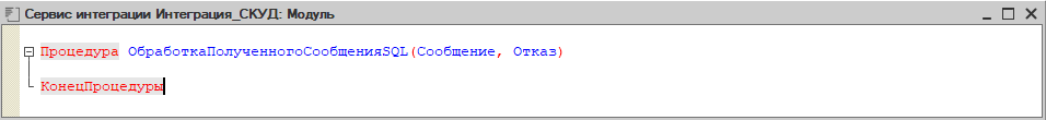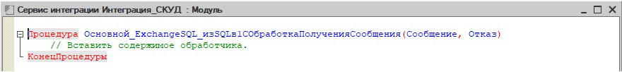 При получении сообщения в целевой информационной базе запускается фоновое задание, которое вызывает обработчик соответствующего канала, поэтому необходимо в модуле сервиса интеграции "Интеграция_СКУД" указать обработчик входящего сообщения.