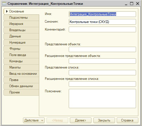 Так как список контрольных точек будет храниться в информационной базе "1С:Зарплаты и управления персоналом КОРП", создадим для этого отдельный справочник "Интеграция_КонтрольныеТочки" без дополнительных реквизитов и включим его в подсистему "Интеграция". Этот справочник будет выгружаться в таблицу SQL "CheckPoints":