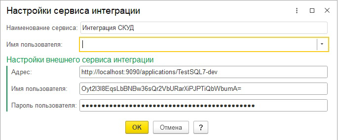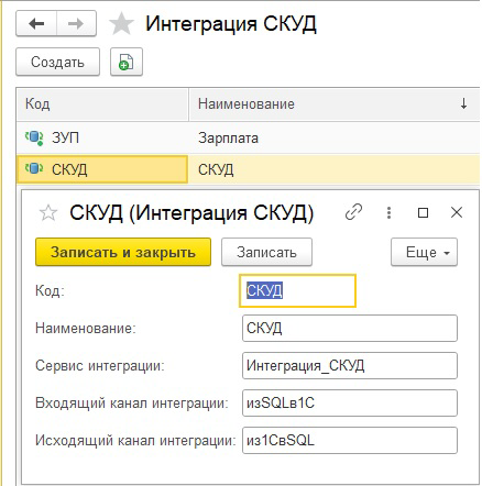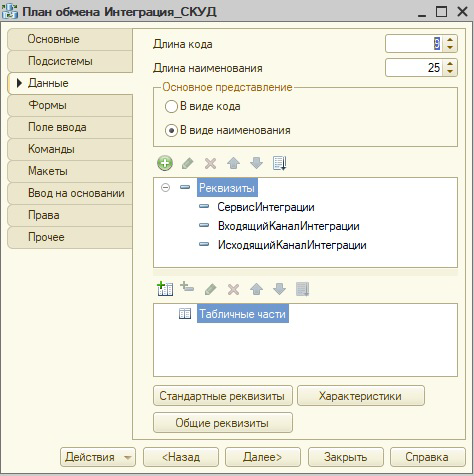 Для регистрации объектов к обмену нужно добавить план обмена "Интеграция_СКУД", в состав которого включить справочники "Физические лица" и "Контрольные точки". Также в план обмена необходимо добавить реквизиты, которые понадобятся для связки плана обмена и сервиса интеграции: