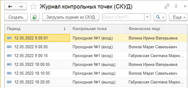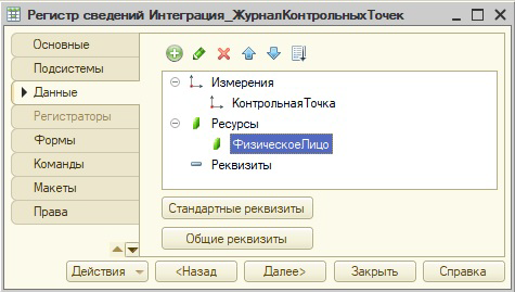Данные из таблицы SQL "CheckPointLog" будут загружаться в информационную базу "1С:Зарплаты и управления персоналом КОРП" в регистр сведений "Журнал контрольных точек (СКУД)". Для этого добавим соответствующий периодический ("в пределах секунды") независимый регистр сведений с измерением "КонтрольнаяТочка" (тип СправочникСсылка. Интеграция_КонтрольныеТочки) и ресурсом "ФизическоеЛицо (тип СправочникСсылка.ФизическиеЛица):