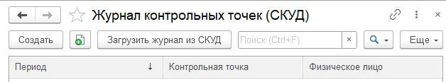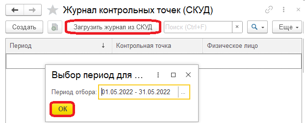 Перейдем в информационную базу "1С:Зарплаты и управления персоналом КОРП" и выполним загрузку журнала контрольных точек. Для этого необходимо открыть регистр "Журнал контрольных точек (СКУД)" и нажать на кнопку "Загрузить журнал из СКУД", указать период отбора и нажать на кнопку "ОК":