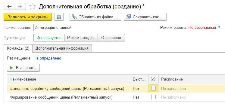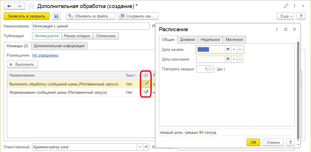 После того как расписание будет задано, нужно нажать на кнопку "Записать и закрыть". После записи дополнительной обработки автоматически будут созданы соответствующие регламентные задания.