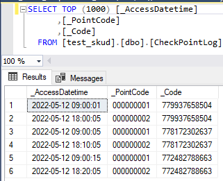 Копировать в буфер обменаSELECT TOP (1000) [_AccessDatetime] ,[_PointCode] ,[_Code] FROM [test_skud].[dbo].[CheckPointLog]