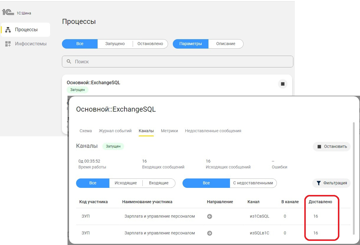 При выполнении регламентного задания "Выполнить обработку сообщений шины" в информационной базе "1С:Зарплаты и управления персоналом КОРП" исходящее сообщение будет передано в "1С:Шину" для обмена, счетчики каналов в приложении должны измениться.