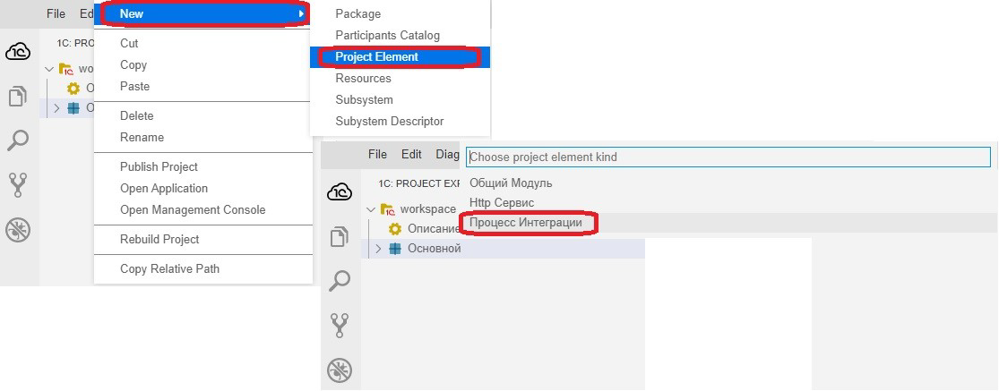 Откроется меню выбора для добавления элемента проекта, в нем нужно выбрать вид добавляемого элемента проекта – "Процесс интеграции", задать имя и нажать "Ввод".