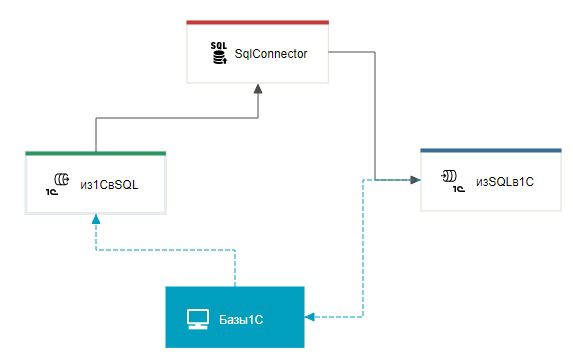 Для соединения узла "Базы1С" с каналами "из1СвSQL" и "изSQLв1С" нужно использовать элемент "Связь". Для соединения каналов "из1СвSQL" и "изSQLв1С" с узлом "SqlConnector" необходимо использовать элемент "Маршрут".