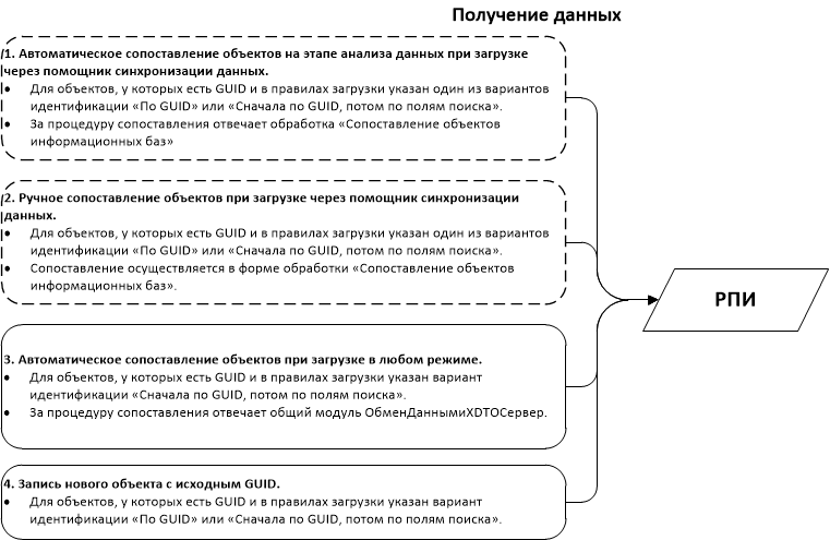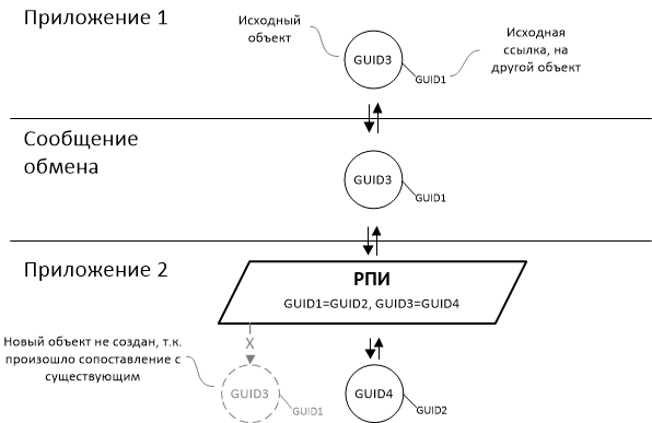 Запись соответствий в РПИ: делается для либо с исходным GUID, либо с вновь сгенерированным, п. 1 не дал результата но объект с таким GUID уже есть в РПИ. |