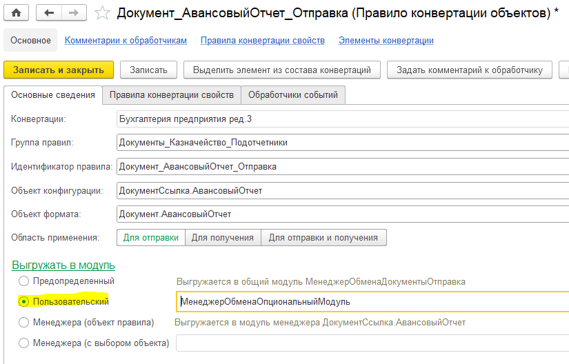 В сложных случаях (например, вместо объекта конфигурации в правиле конвертации используется произвольная структура данных) можно явно указать Объект конфигурации, в модуль менеджера которого будет производиться выгрузка данных:
