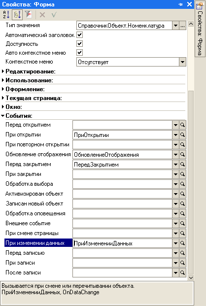 Ниже показана палитра свойств для формы элемента справочника "Номенклатура" с несколькими назначенными обработчиками событий: