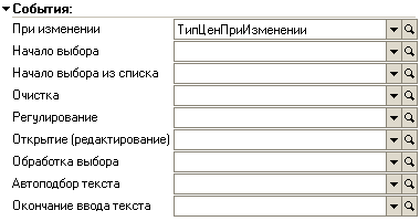 Обратите внимание на важный момент, имя процедуры-обработчика событий может не совпадать с именем события. Для элементов управления чаще всего так и бывает, например, процедура "ТипЦенПриИзменении" обрабатывает событие "ПриИзменении" поля ввода для реквизита "ТипЦен", как показано на следующем рисунке: