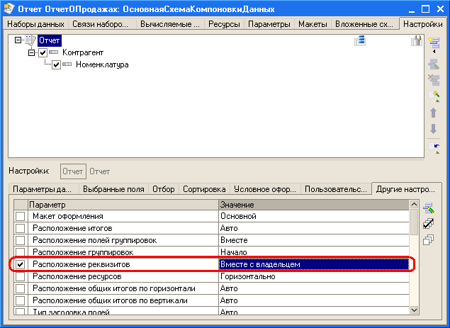 Система компоновки данных предоставляет широкие возможности для расположения полей – реквизитов в отчете. Управлять расположением реквизитов можно используя настройки компоновки данных. При использовании конструктора схемы компоновки данных необходимо перейти на закладку "Настройки", а затем выбрать закладку "Другие настройки". На данной закладке находится свойство РасположениеРеквизитов, позволяющее управлять расположением реквизитов в отчете.