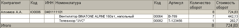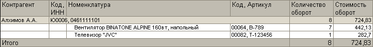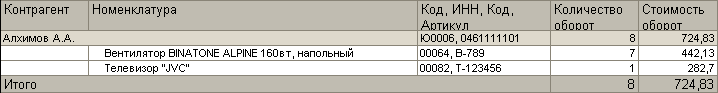 • Отдельно – для каждого реквизита создается отдельная колонка. На указанном ниже рисунке для каждого реквизита контрагента и номенклатуры создано по отдельной колонке, причем колонки реквизитов контрагента располагаются после колонки Контрагент, а колонки реквизитов номенклатуры отображаются после колонки Номенклатура;