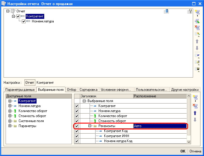 Система компоновки данных предоставляет возможность изменять расположение групп выбранных полей. Для управления расположением группы выбранных полей используются настройки компоновки данных. При использовании конструктора схемы компоновки данных необходимо перейти на закладку "Настройки", а затем выбрать закладку "Выбранные поля". Если на данной закладке в табличном поле, отображающем выбранные поля, сделать активной какую-либо группу, то в табличном поле появится колонка Расположение, позволяющая управлять расположением выбранных полей в группе.