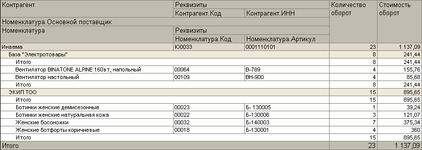 Также стоит заметить, что отбор, применяемый в группировке, влияет на отображение общего итога по данной группировке. Например, в указанном ниже отчете для группировки Номенклатура установлен отбор. Соответственно, в общем итоге по группировке Номенклатура указаны количество и стоимость с учетом отбора, тогда как для вышестоящей группировки Номенклатура.Основной поставщик указывается количество и стоимость без учета отбора.