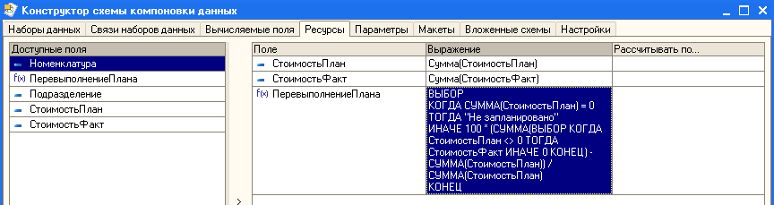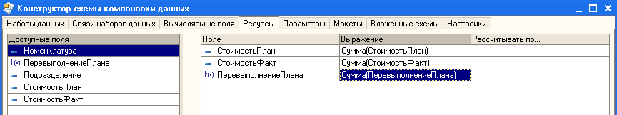 Для того чтобы по вычисляемому полю можно было рассчитывать итоги, добавим данное поле в список ресурсов. В конструкторе схемы компоновки это делается на вкладке Ресурсы. Выберем поле и добавим его в список ресурсов. Аналогичную операцию выполним и для полей СтоимостьПлан и СтоимостьФакт.