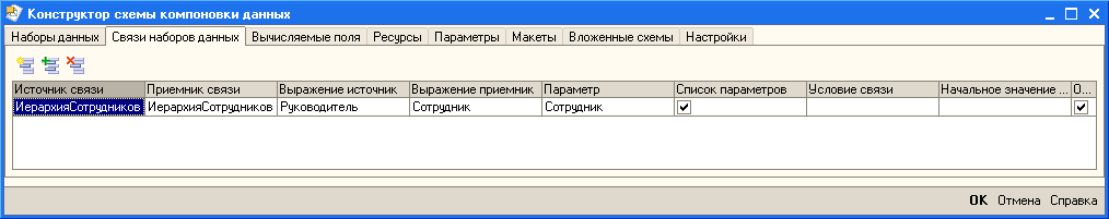 Для того чтобы данный набор данных получал по иерархии всех руководителей, опишем связь. В конструкторе схемы компоновки данных это делается на закладке "Связи".