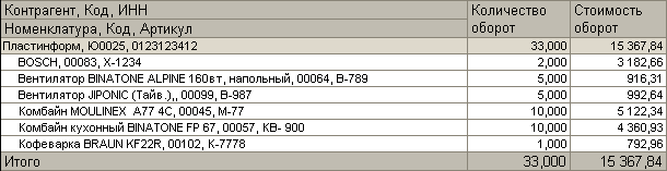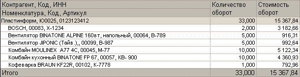 Поясним использование условных оформлений на следующем примере. Предположим, существует отчет о продажах, содержащий группировки Контрагент и Номенклатура. В данном отчете необходимо выделить жирным шрифтом - строки, отображающие контрагентов, наклонным шрифтом - строки, отображающие номенклатуру. При этом, если количество проданного товара больше 5, то необходимо отображать текст в полях КоличествоОборот и СтоимостьОборот красным цветом. Стиль рамки в отчете требуется изменить на пунктирный.