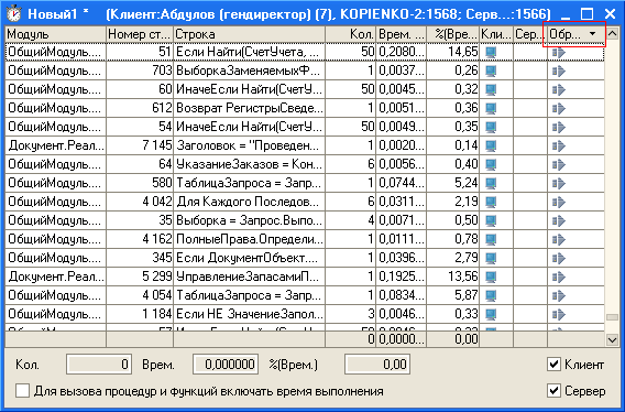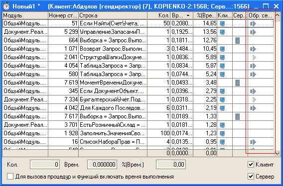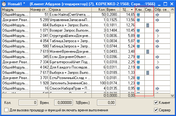 2) вызовы клиентских процедур и функций, в которых тем или иным способом происходил вызов сервера, отображаются в замере производительности в колонке "Обр. сервером" ("Обработка сервером") с помощью значка
