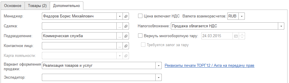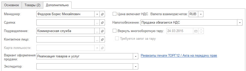 1. Большинство реквизитов во вкладке "Дополнительно" после применения обработки выровнены по опорной линии. Необходимо выровнять два последних поля ("Вариант оформления продажи" и "Экспедитор").