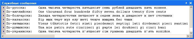 В данном разделе приведены примеры, как задать параметры предмета исчисления для вывода различной валюты на различных языках с использованием функции ЧислоПрописью():