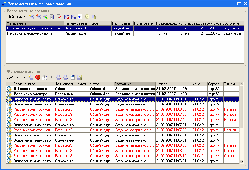 Журнал регистрации позволяет отследить выполнение фоновых заданий, когда недоступны другие средства. При запуске фонового задания в журнал регистрации записывается событие начала выполнения фонового задания. По окончании выполнения фонового задания записывается событие успешного завершения или описание ошибки, если фоновое задание выполнено с ошибкой.