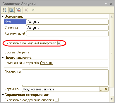 1. Для той подсистемы, к которой относится искомый объект, и всех подсистем, которые находятся выше ее по иерархии установлено свойство подсистемы Включать в командный интерфейс. Для этого вызовем контекстное меню подсистемы Закупки и откроем палитру свойств этой подсистемы.