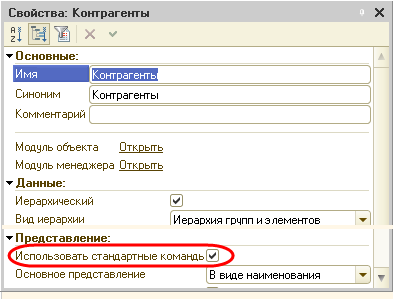 1. Что для искомого объекта разрешено использование стандартных команд. Для этого вызовем контекстное меню справочника Контрагенты и откроем палитру его свойств.