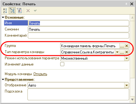 Если для команды назначена не группа подсистемы, а какая-то группа формы, то для того, чтобы команда стала доступна в интерфейсе форм необходимо задать еще и тип параметра этой команды (см. п.2 ниже).