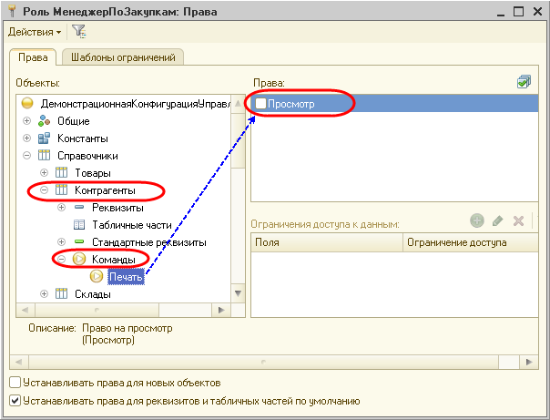 4. Откроем окно редактирования роли (например, Менеджер по закупкам) и проверим, что в правах этой роли разрешено использование искомой команды. Если речь идет о стандартной команде (например, открытия списка справочника) – нужно проверить права на сам объект.