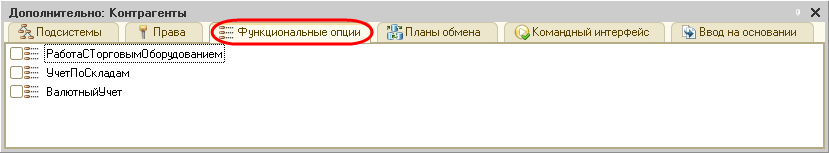 В нашем случае подсистема не связана ни с одной из функциональных опций. Это значит, что отображение подсистемы в интерфейсе не будет зависеть от значения функциональной опции в прикладном решении.