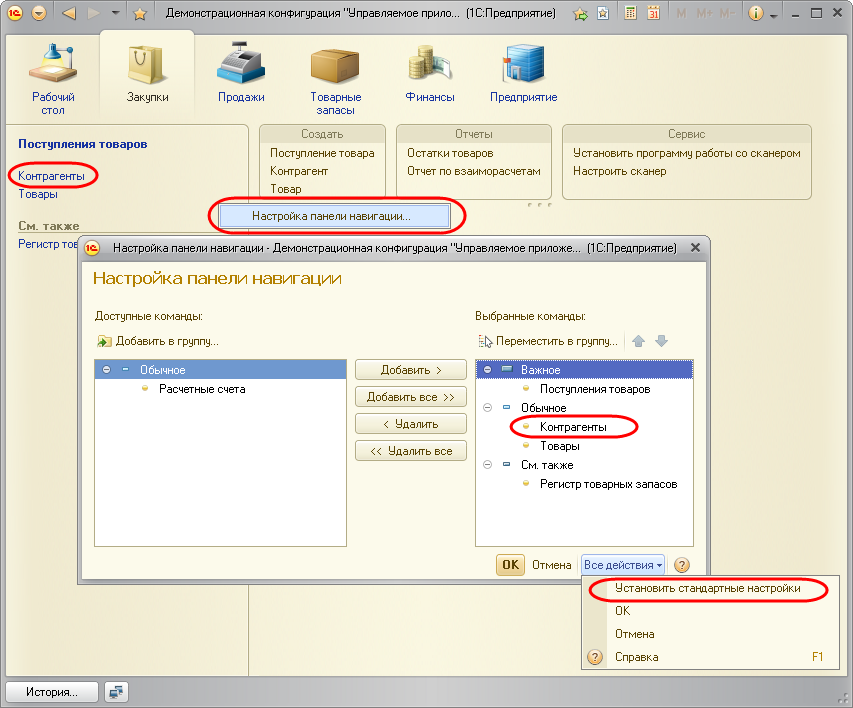 Вернуться к настройкам, выполненным в конфигураторе, можно с помощью команды Все действия – Установить стандартные настройки.