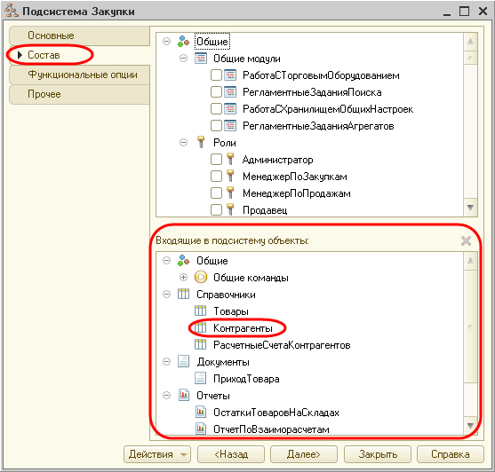 3. Откроем состав объектов подсистемы и убедимся, что подсистема включает в себя хотя бы один объект конфигурации. Если подсистема не содержит ни одного объекта, она не будет отображена в командном интерфейсе. Для этого в окне редактирования подсистемы Закупки откроем закладку Состав.