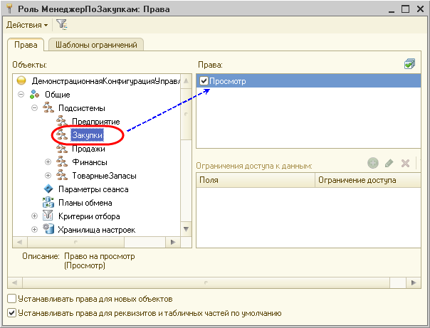 5. Если в конфигурации созданы пользователи, и им назначены определенные роли, то убедимся, что в правах пользователя разрешено использование той подсистемы, к которой относится искомый объект, и всех вышестоящих по иерархии подсистем. Для этого откроем окно редактирования роли (например, Менеджер по закупкам), которая назначена пользователю, под именем которого будет происходить работа с прикладным решением.