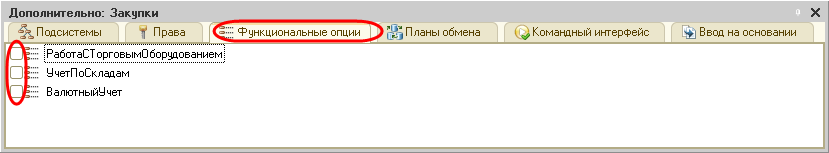 6. Если в конфигурации созданы функциональные опции, и они связаны с каким-либо объектом конфигурации, то этот объект будет отображен в интерфейсе только в случае, если соответствующая функциональная опция включена в прикладном решении. Поэтому убедимся, что та подсистема, к которой относится искомый объект, и все вышестоящие по иерархии подсистемы, не отключены функциональными опциями в режиме исполнения. Для того, чтобы узнать, с какими функциональными опциями связана подсистема, вызовем контекстное меню подсистемы Закупки и выполним команду Дополнительно.
