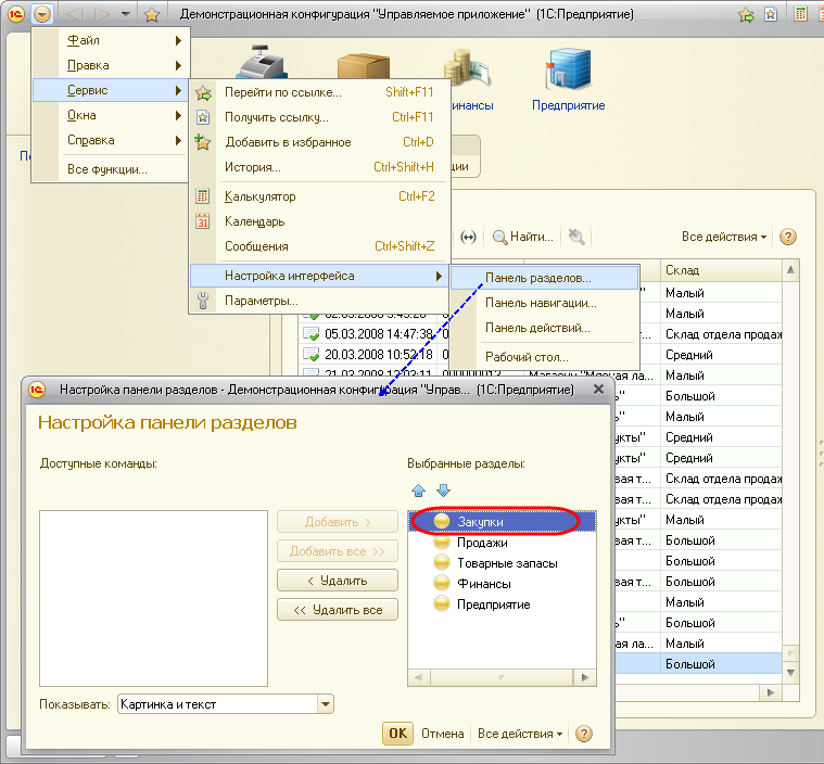 7. В заключение, в режиме 1С:Предприятие проверим, что раздел, к которому относится искомый объект, и все вышестоящие по иерархии разделы, не отключены пользовательскими настройками панели разделов.