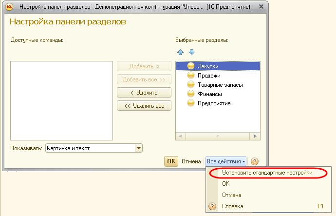 Вернуться к настройкам, выполненным в конфигураторе, можно с помощью команды Все действия – Установить стандартные настройки в окне настройки панели разделов.