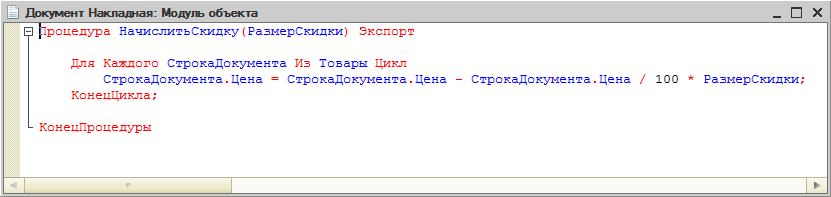 После этого мы вызовем экспортируемую процедуру этого прикладного объекта – НачислитьСкидку(). В результате ее работы все цены, содержащиеся в табличной части объекта, будут уменьшены на 10 %.